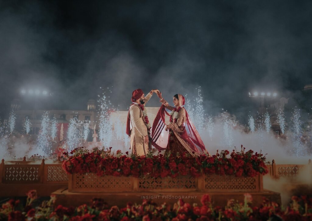 Clapout Events curated and executed a grand wedding celebration with premium stage design,fireworks entry moment, floral aesthetics, and seamless event coordination.